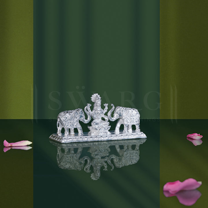 Pure Silver Goddess Gaj Laxmi/Lakshmi BIS HALLMARKED Solid Idol Sitting on Lotus Flower with 2 Elephants/Gaj at Both Sides (925 Purity)