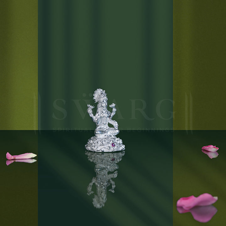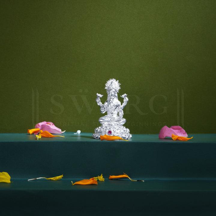 Lakshmi or Laxmi , is the Hindu goddess of wealth, fortune and prosperity. She is one of the principal deities of Hinduism and the Supreme Being in the Vaishnavism Tradition. She typically holds a lotus in her hand, a symbolism for fortune, self-knowledge and spiritual liberation. Here we Present, Silver Lakshmi Idol with 92.5% Purity. It comes with a Sleek Design & Shiny Appearance along with a Colour Stone. Bringing this Idol to your home adds up the Indian Cultural touch to your Home Décor.