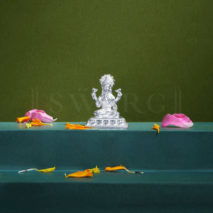 Lakshmi or Laxmi , is the Hindu goddess of wealth, fortune and prosperity. She is one of the principal deities of Hinduism and the Supreme Being in the Vaishnavism Tradition. She typically holds a lotus in her hand, a symbolism for fortune, self-knowledge and spiritual liberation. Here we Present, Silver Sitting Lakshmi Idol with 92.5% Purity. It comes with a Sleek Design & Shiny Appearance along with a Swastik Impression on its Back. Bringing this Idol to your home adds up the Indian Cultural touch to your Home Decor.