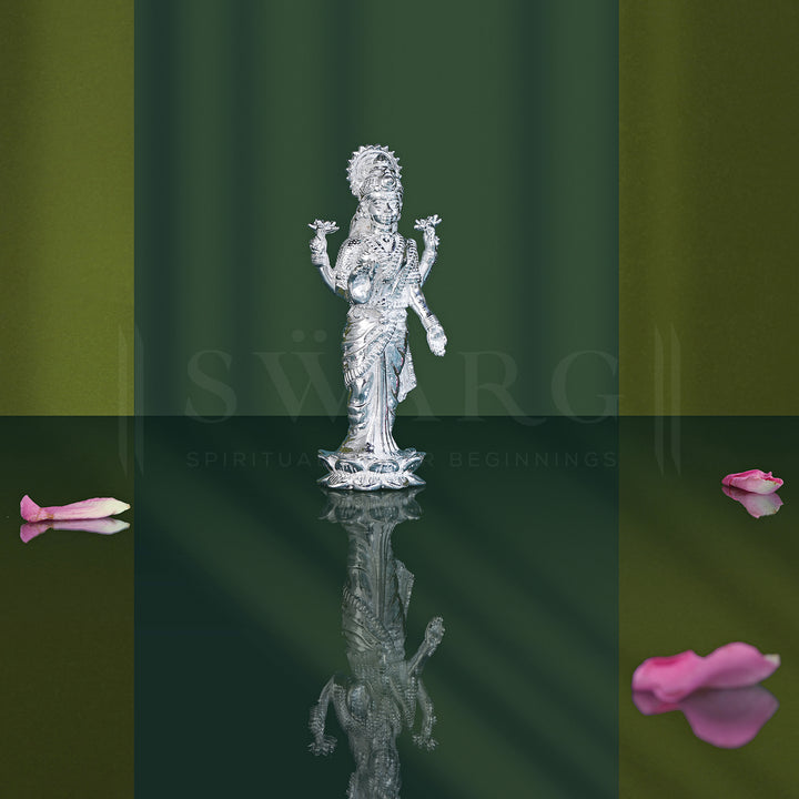 Goddess Lakshmi/Laxmi, is the Hindu Goddess of Wealth, Fortune and Prosperity. She is one of the principal deities of Hinduism and the Supreme Being in the Vaishnavism Tradition. She typically holds a Lotus in her hand, as a Symbolism for Fortune, Self-Knowledge and Spiritual Liberation. Here we Present, Silver Lakshmi/Laxmi Idol/Murti with 92.5% Purity. It comes with a Sleek Design & Shiny Appearance. Bringing this Idol to your home adds up the Indian Cultural touch to your Home Decor.