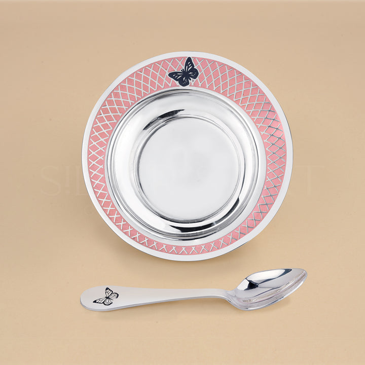 Celebrate mealtime milestones with our Premium Pure Silver Bowl & Spoon Set, featuring a graceful butterfly motif and a soft pink lattice border that exudes timeless charm. Thoughtfully crafted from 92.5%...