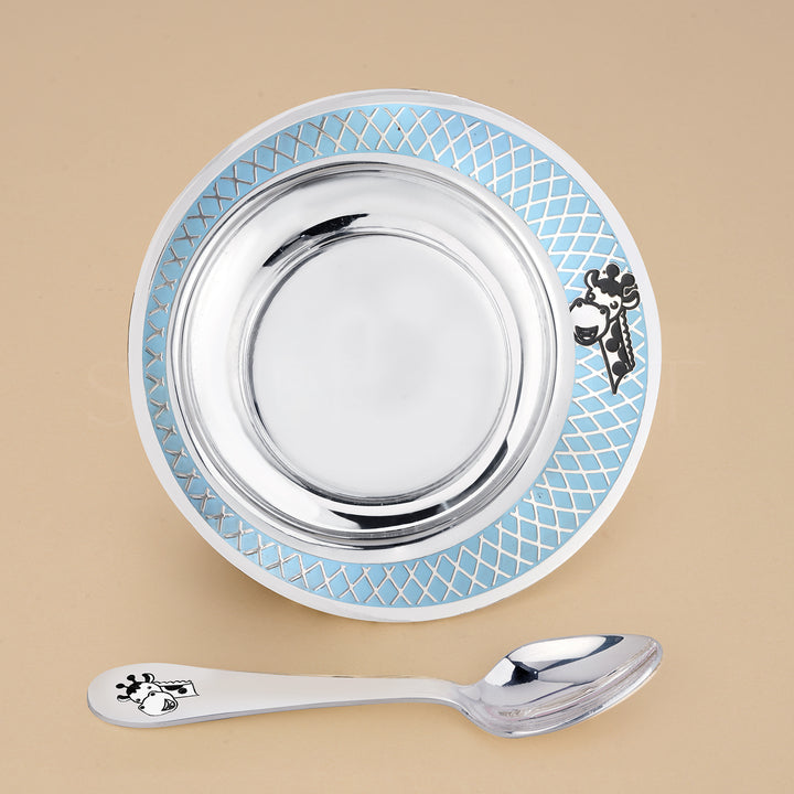 Pure Silver Premium Baby Bowl & Spoon Set – Giraffe Motif with Blue Accent | Whimsical, Safe & Keepsake-Ready (92.5 Purity, 150 Grams))