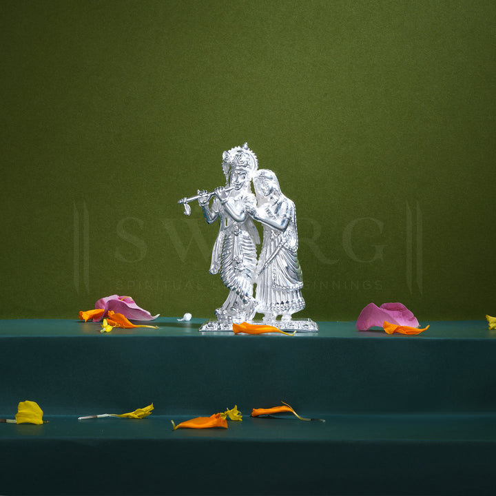 Lord Krishna is worshiped as the Eighth Avatar of the God Vishnu and also as the supreme God in his own right. Radha is Lover of Hindu God Krishna. It is believed that Krishna enchants the world, but Radha enchants even Him. Therefore She is the Supreme Goddess of all. Here we present, Silver Radha Krishna Solid Idol with 92.5 Purity which resembles the Endless Love between the Supreme Goddess and God Radha and Krishna. It comes with a Sleek Design & Shiny Appearance. Bringing this Idol to your home adds up the Indian Cultural touch to your Home Décor.
